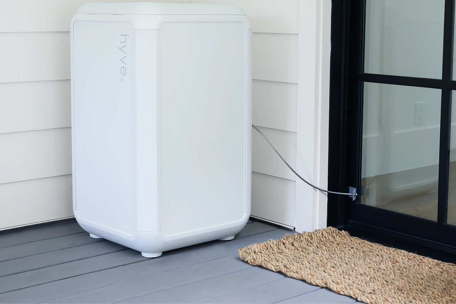 hyve ships standard with our universal security tether, which can be anchored to the hinge side of your front door or tethered around a gate or fencepost.